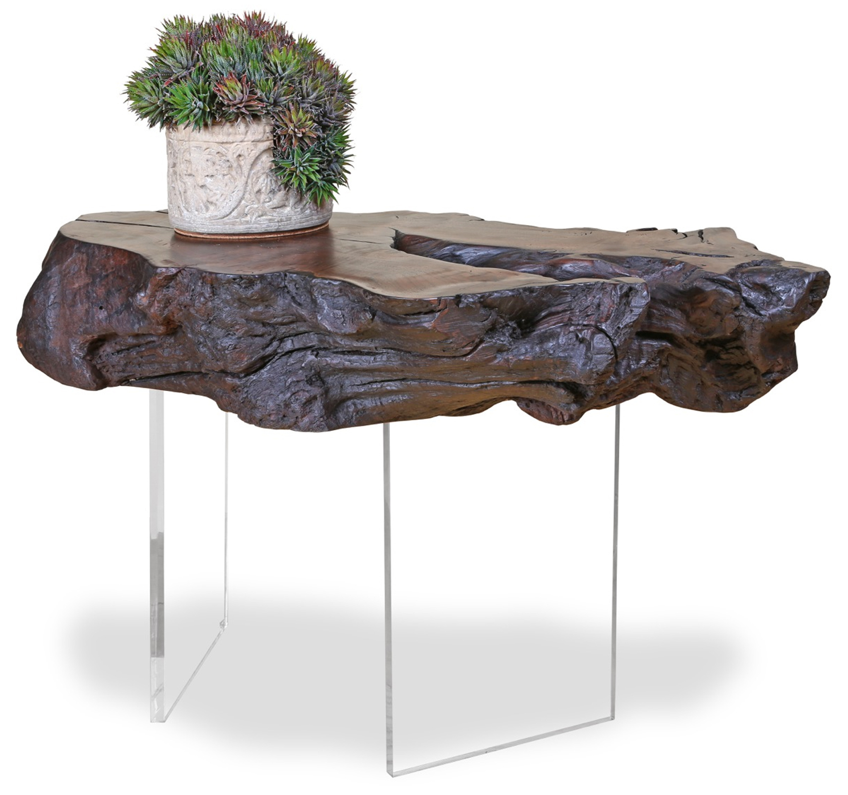 This unique iteration in our walnut "Catalina" series features an organic, sculptural solid slab of reclaimed California black walnut. Raised on two dynamically positioned slabs of crystal clear acrylic, the dramatic slab appears to float. Shown in our "Warm Bleach" finish, each console is unique. Other sizes are available and the console may be finished in natural walnut or bleached as shown.