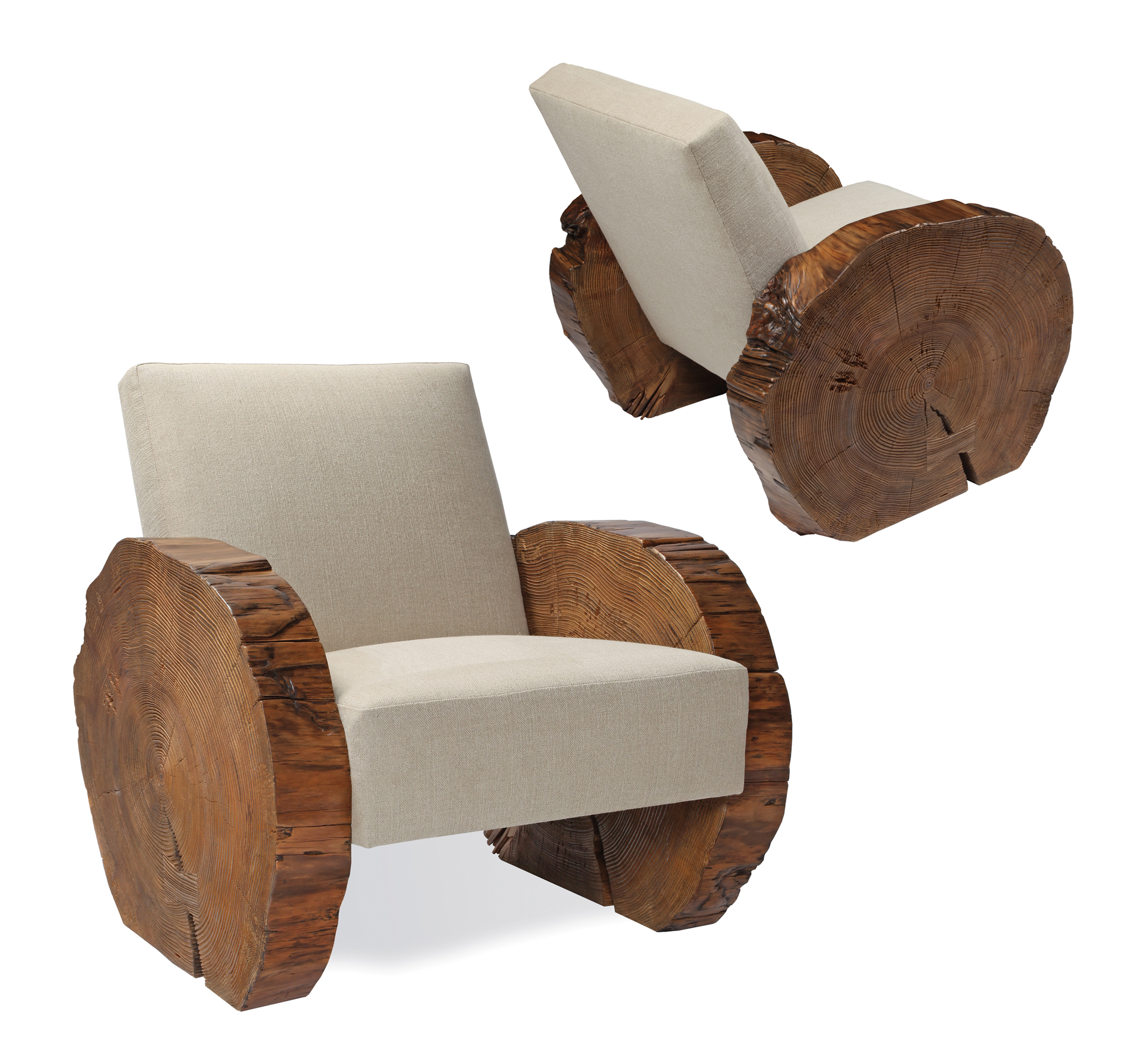Mimi London meets Art Deco in this sculptural, whimsical yet comfortable take on a classic Art Deco smoking chair. Reclaimed, sand-blasted spruce "coins" create the arms of this sleek design.