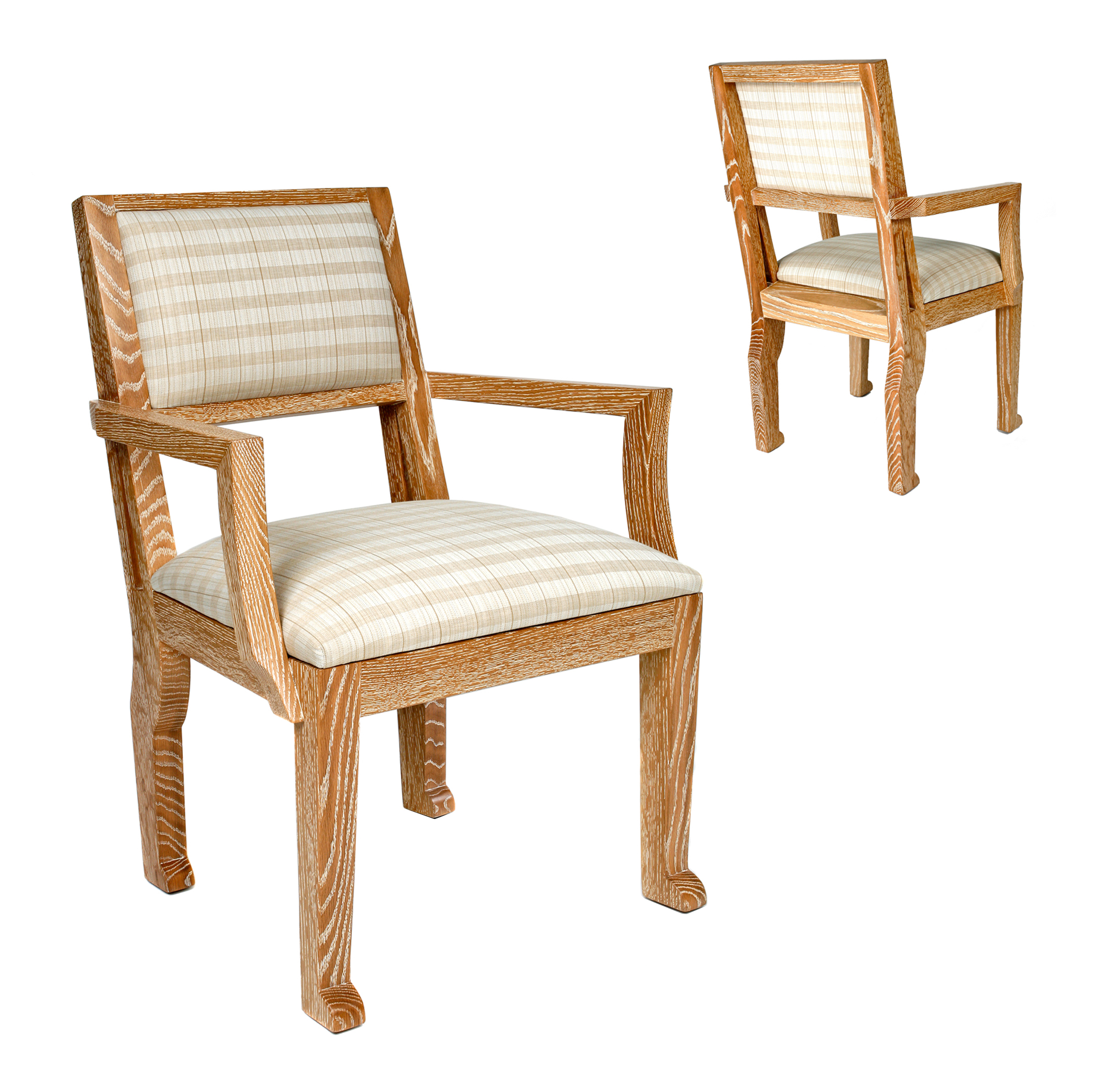 The French originals from the 20's have been updated in both scale and comfort. Featuring simplified "paw" feet giving the design a sense of humor. Shown in cerused oak, they can be finished to any request. Also available as a side chair.