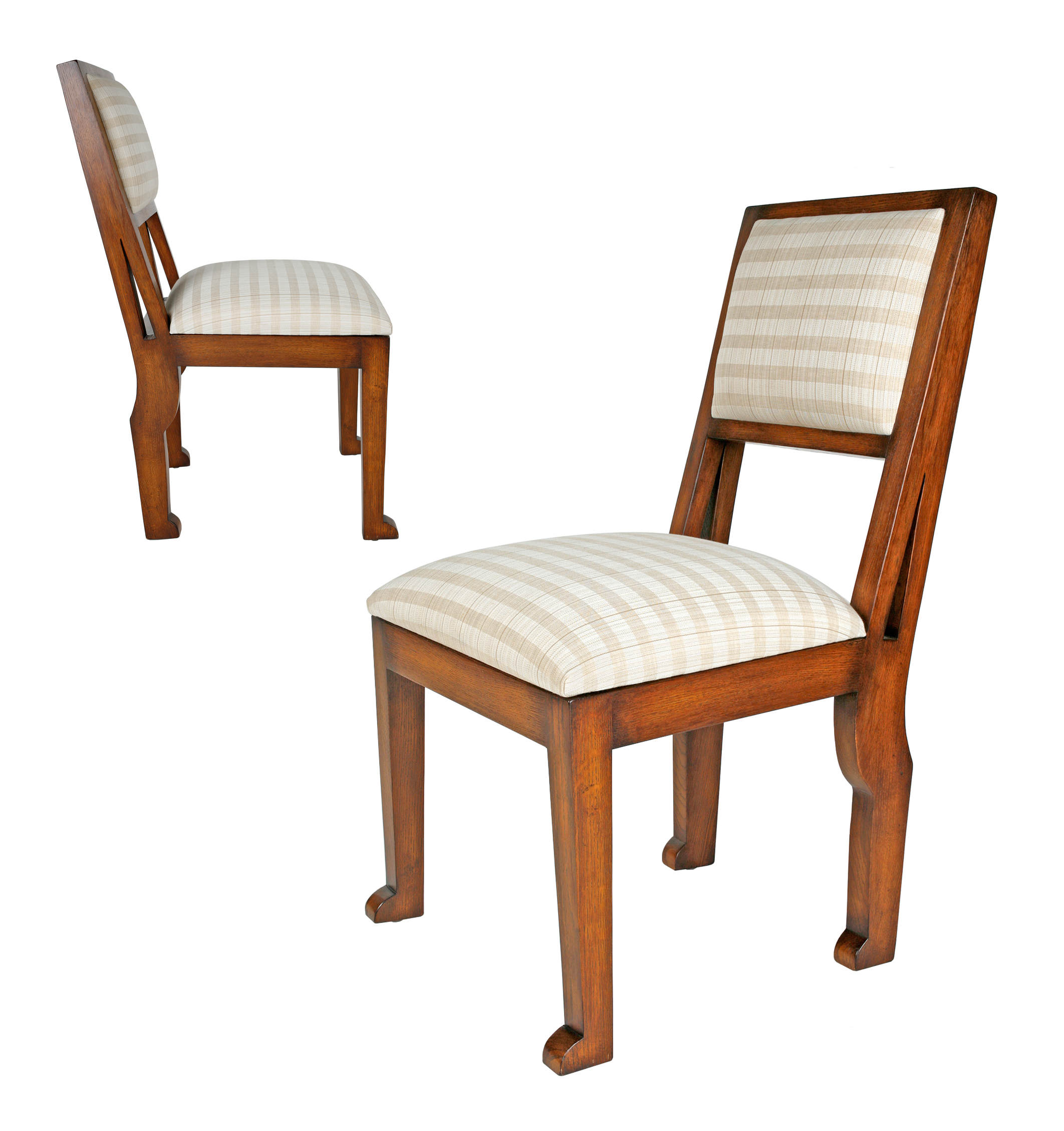 The French originals from the 20's have been updated in both scale and comfort. Featuring simplified "paw" feet giving the design a sense of humor. Shown in a walnut finish on oak they can be finished to any request. Also available as an arm chair.