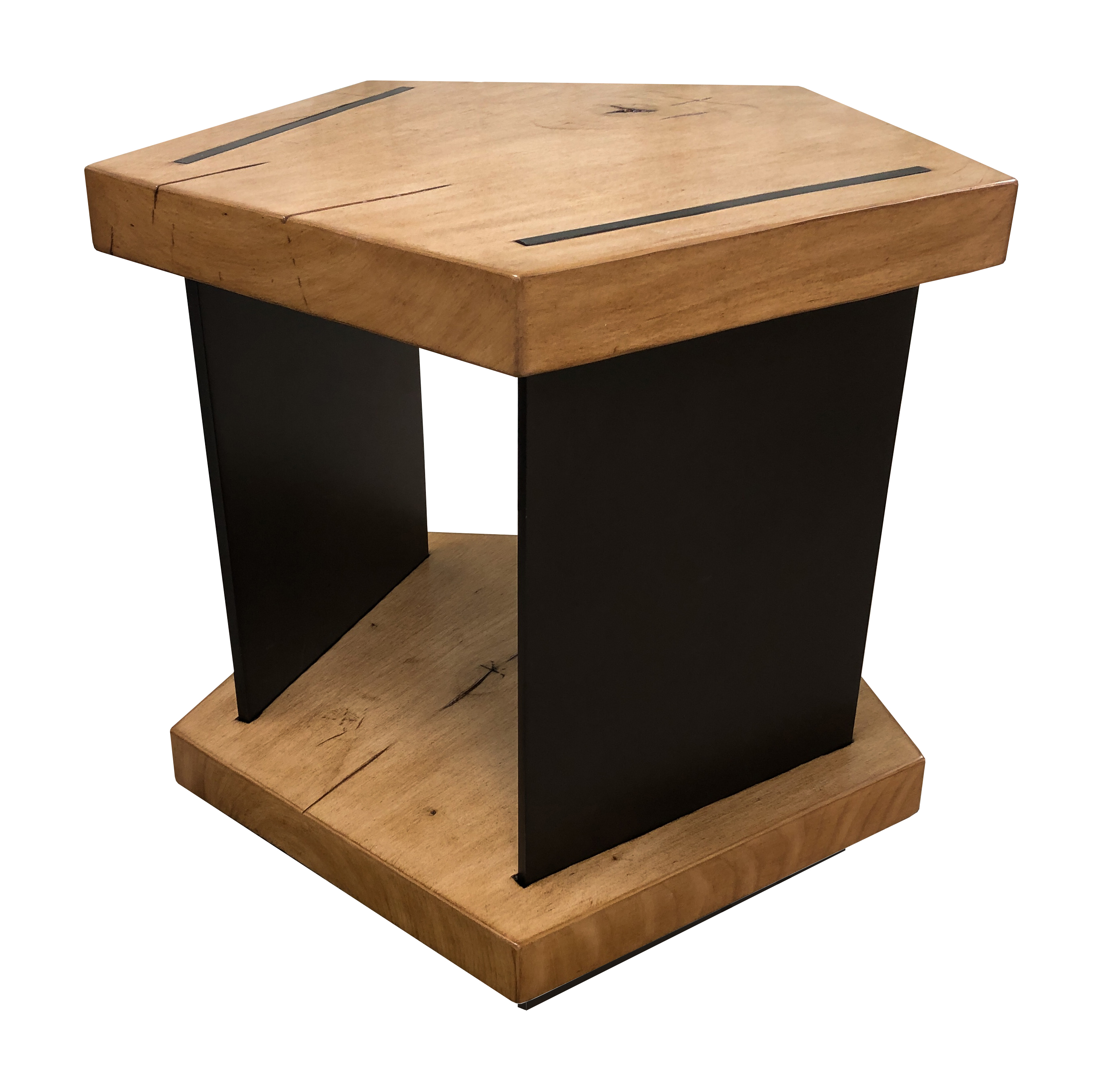 Custom designed for a client's beachfront getaway, these contemporary, pentagon-shaped occasional/night tables feature naturally finished slab steel sides, topped with hand-cut and finished spruce tops. Can be custom sized. Any MLI finish.