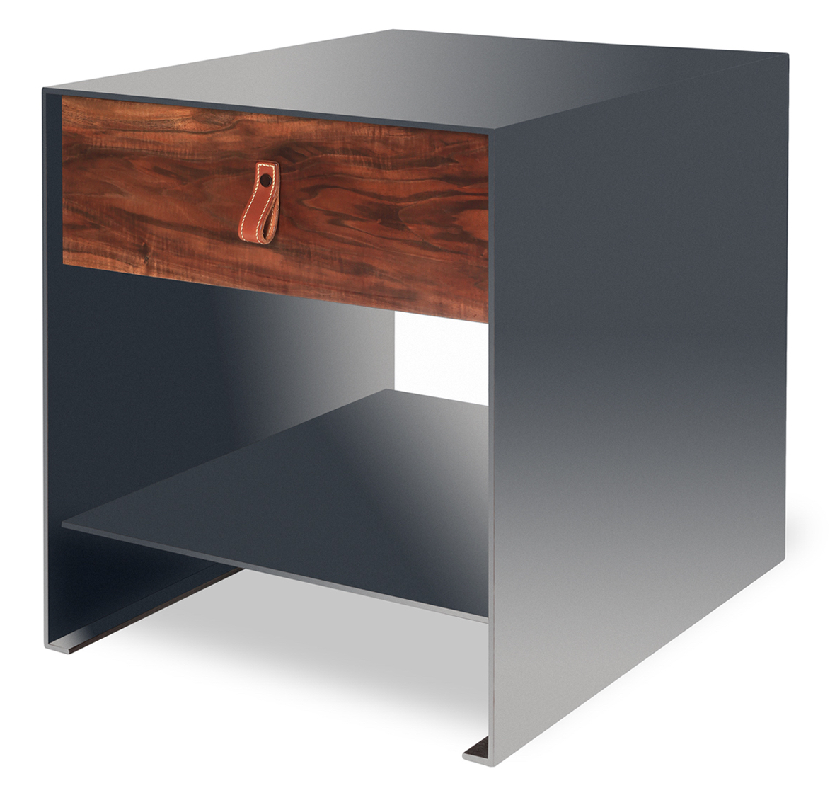 A clean, architectural occasional table encased in a rusticated or smooth steel "shell" which includes a shelf. The drawer face and rear of the drawer of natural, reclaimed black walnut featuring leather tab pull.