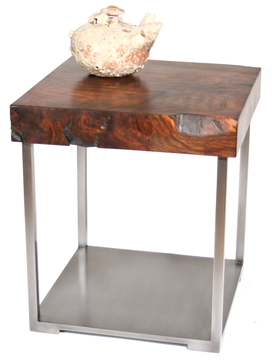A clean-lined, useful, architectural design featuring reclaimed California Black Walnut, raised on a minimalist, fine-legged steel base. Great as bedside table, next to a sofa, or between a pair of club chairs.