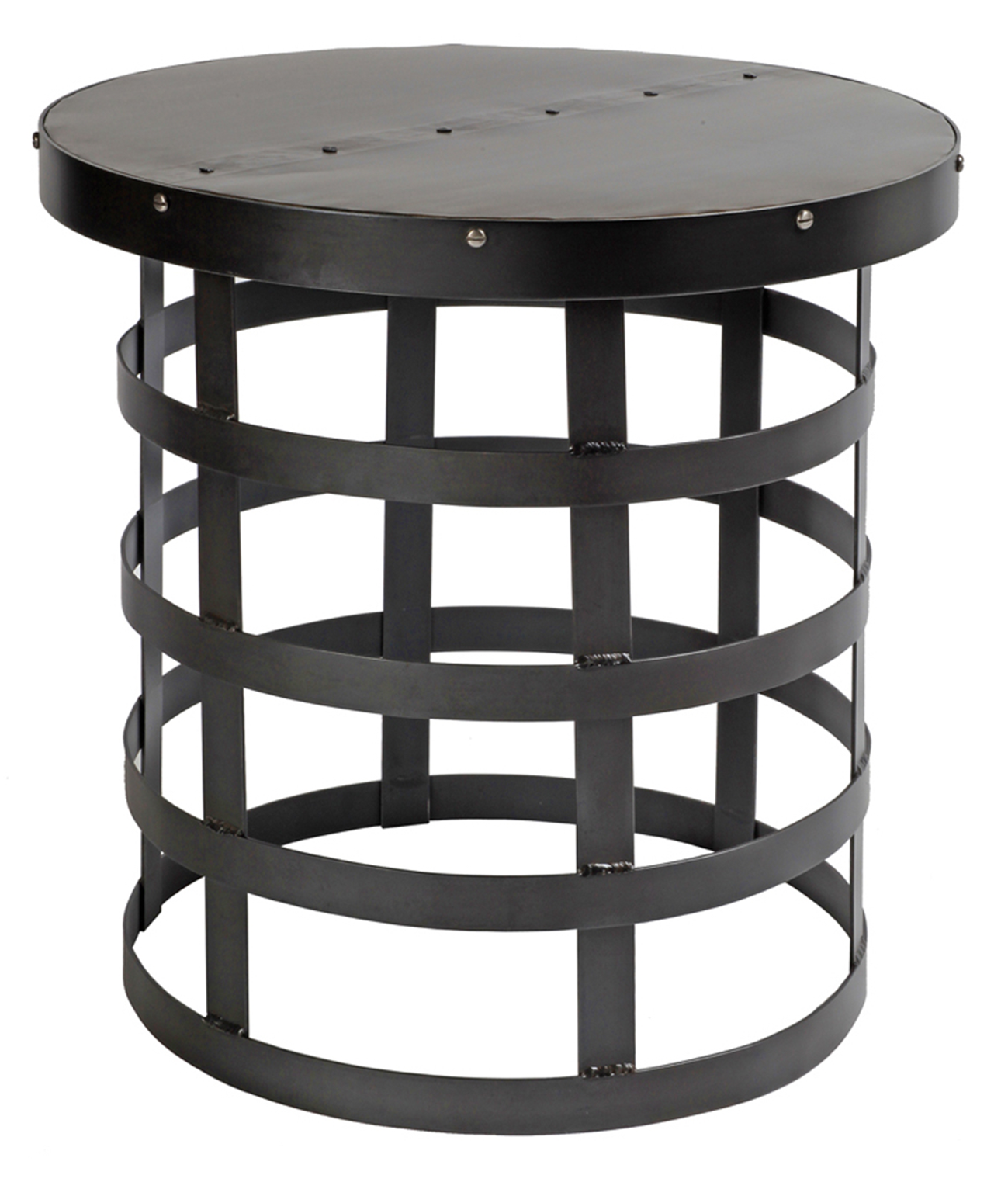 This unusual design was interpreted from a vintage, 40's, industrially-inspired original. Named for its unique, basket-like steel base, the top is available in a variety of galvanized metal or wood finishes-- "belted" with a textured steel and riveted surround. Custom sizes and configurations are available, including use as an intriguing, pedestal-based, round dining table.