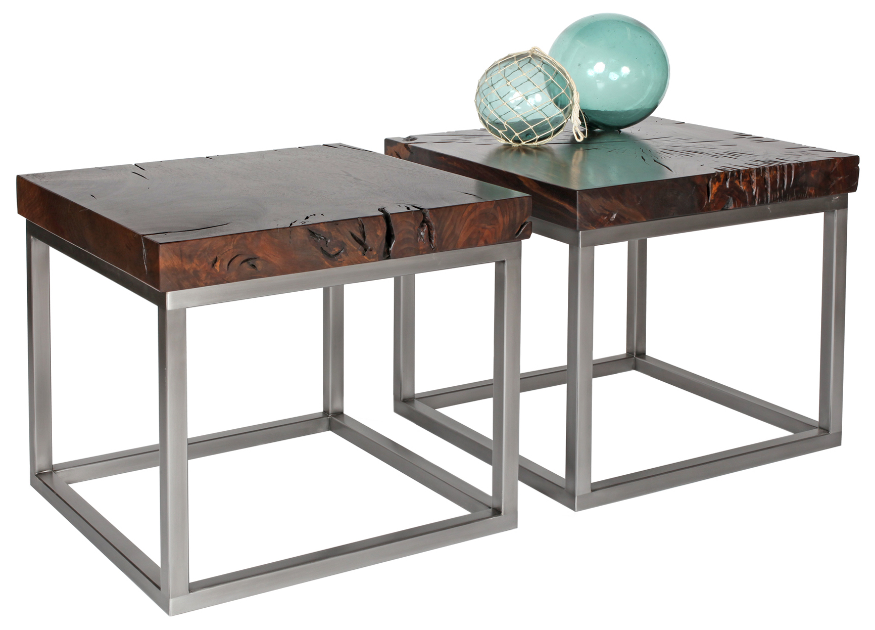 A clean, architectural cocktail table featuring 3" solid slabs of reclaimed California walnut. Raised on clean, crisp steel bases, the tables can stand alone as occasional tables or as a pair to form a cocktail table.