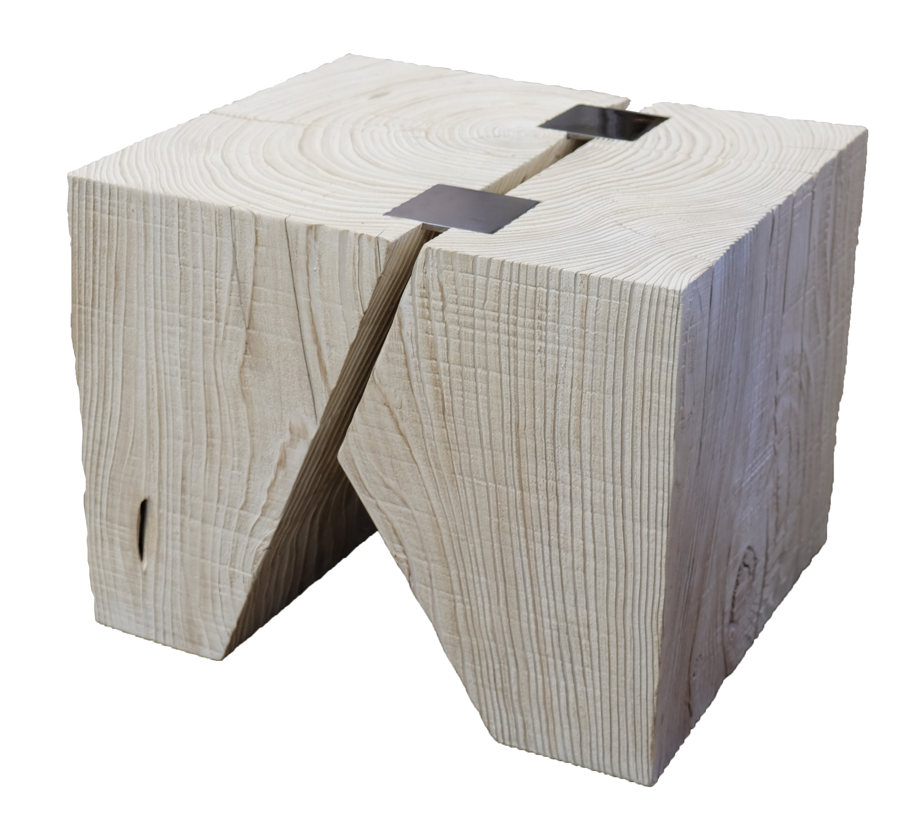 A study in balance and form. Inspired by the tip of a pair ballet dancer’s toe shoes, the two solid spruce forms “balance” on the table’s narrow feet, flaring upward to the expanded tops—the two joined by custom inset steel “staples” –in this example, polished chrome. Shown in our new, sandblasted “Whitewash” finish. Designed by MLI colleague, Courtney Jursik-Skelton.