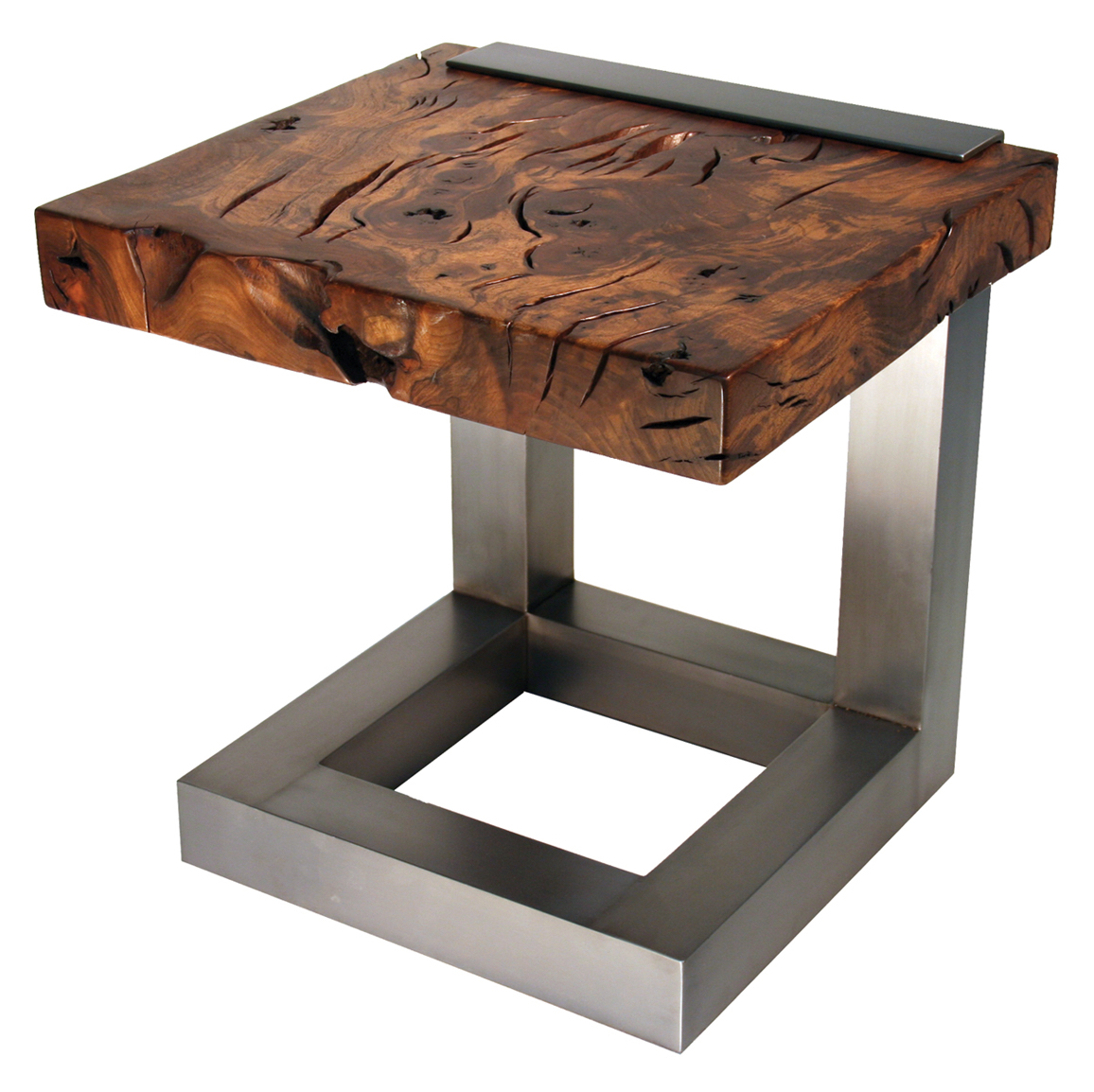 Part of our popular "Palisades" series, a single 3 1/2" thick, hand-cut and fitted reclaimed California walnut top is "clasped" by a clean, crisp steel base. Available in custom sizes and in any MLI finish. Also available as cocktail table and console versions.
